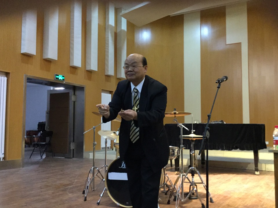 交流活动以“舞动生命的乐章”为主题展开,林水永先生以极其生动幽默的语言和新颖的互动式授课方式,向大家阐述了打击乐的灵魂不在于技巧,而是在于对节奏基本概念的认知和实践的应用。林教授首先阐述了打击乐应该建立在对节奏的认知上,而非打击乐器本身,并以互动的方式与在场师生感受节奏的魅力。然后林教授由基本节奏型谈到了由之引伸而出的各种节奏风格,并在爵士鼓上进行了精彩的示范。参加交流活动的师生都被林水永教授形象的语言和丰富的肢体动作所吸引,感受到了节奏世界的无限魅力。