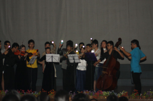 晚会在吹打乐《山乡情》激情悠扬的曲调中拉开帷幕,该作品是由欧冠官方网站郝益军教授作曲,我院民族乐团演奏,曾在山东大学生文艺汇演中获一等奖。接下来的女声独唱《红旗飘飘》,激情四射的演唱激发了每一个人的爱国情感。当晚会进行到弦乐重奏《宫崎骏原声音乐》时,现场突然发生断电事故,但感人的一幕出现了,我院杨晓飞等演奏者并没有因此停止演奏,在后台多名工作人员和演员手机电筒灯光的照耀下下坚持把优美的曲子演奏完整,显示了我院学生执着认真的演出态度,获得了台下观众的交口称赞,并在观众强烈的要求下又献上了另一首弦乐重奏曲目,场面和谐感人。情景剧《一个都不能死》,让我们回想起中国共产党领导中国人民英勇抗战的峥嵘岁月。为给现场维修人员赢得时间,我院张洪海和张强同学深情演唱了四首流行歌曲,带动了晚会的气氛,赢得台下阵阵欢呼。原创街舞《流星雨》,富有节奏感的音乐与王冠飞和倪英凯动感的舞姿融合在一起,为大家带来了一场精彩的舞台盛宴。新民乐演奏《赛马》带给了观众耳目一新的感觉。最后,晚会在男女声二重唱《举杯吧!朋友》欢快的歌声中结束了,现场气氛十分热烈。