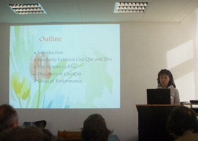 周明老师分别从考古发现、史书记载以及民间存现几个方面对我国具有悠久历史的挫琴做了详细介绍,现场演奏并当场向基金会捐赠了这把复制的挫琴,这是我国首次将古老的弓弦乐器“挫琴”带入世界舞台。发言引起了中外学者对挫琴的极大兴趣并与周明老师做了深入的交流探讨。发言结束后,“磬”基金会主席Frank Kouwenhoven及夫人邀请周明老师再次面谈,并就如何保护与发展这件古老的乐器等具体的问题提出了中肯的建议。这将对我国优秀文化遗产的传承与保护具有重要的意义。
