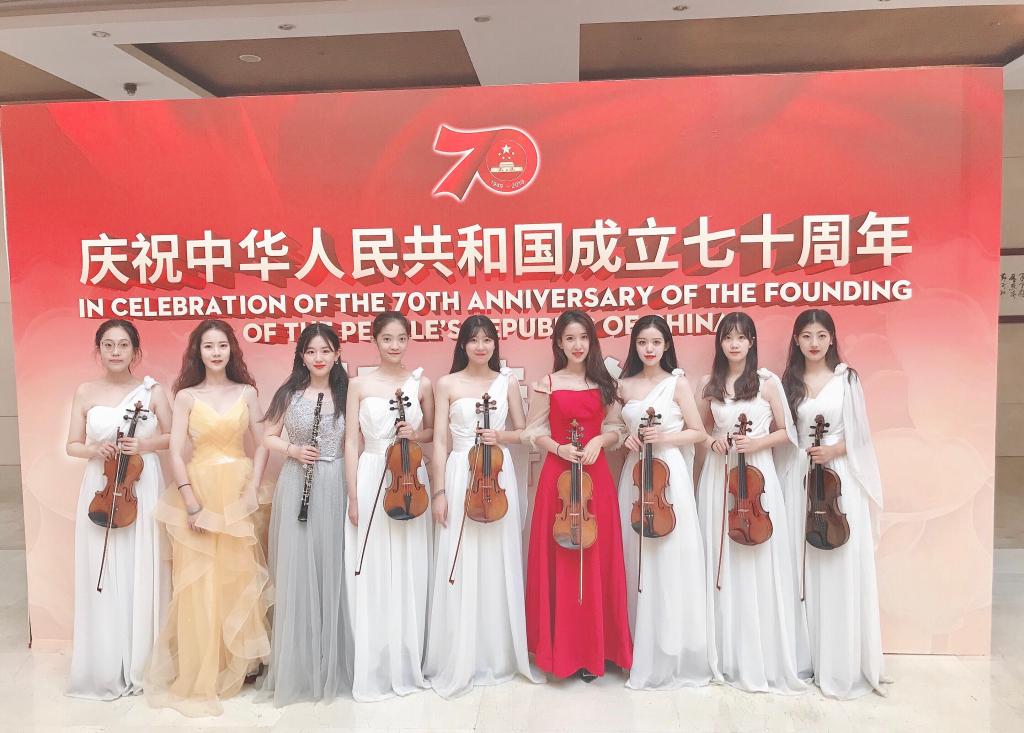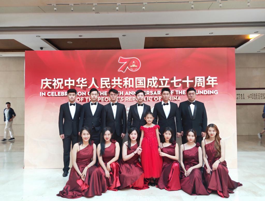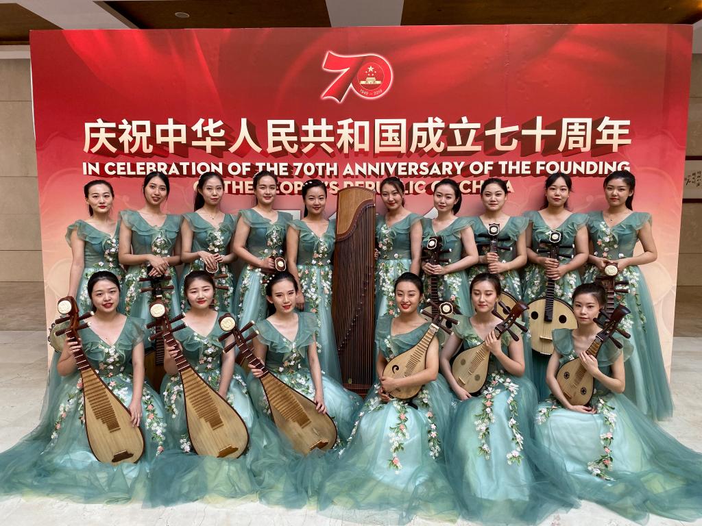 招待会文艺演出中,我院部分同学以快闪的形式表演的歌曲《我和我的祖国》,女子弹拨乐团演奏的《沂蒙踏春》等节目,展现了我院学生良好的艺术修养与水平,表达了对祖国母亲70华诞的美好祝愿,受到一致好评。