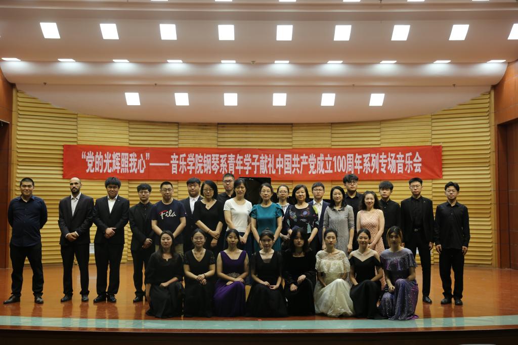 中国共产党成立于1921年,走到今天已经整整100个年头。百年来,我们党历经风雨,克服千难万阻,从红军时期的万里长征、抗日战争时期的浴血奋战、解放战争时期的为人民而战、抗美援朝战争时期的誓死捍卫国家尊严,再到带领全国人民走向全面小康,无一不体现出我们党强大的领导力、非凡的气魄。音乐会上,《新疆随想曲》《南海小哨兵》《山丹丹花开红艳艳》《解放区的天》 《翻身的日子》《军民一家亲》《我的祖国》《翻身道情》《松花江上》《红星闪闪放光彩》 《八幅水彩画》《社员都是向阳花》《绣金匾》《常青就义》《浏阳河》《黄河颂》等耳熟能详的曲目,由钢琴系的学生们联手奉献,体现了中国共产党历经百年风雨的艰辛与不易,和为实现中华民族伟大复兴、为人民谋幸福的信心与决心,40名钢琴专业青年学子通过琴声表达了爱国爱党爱社会主义爱家乡的深厚情感和赤子之情,为现场观众们献上了精彩的视听盛宴。
